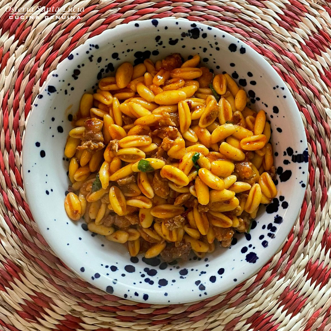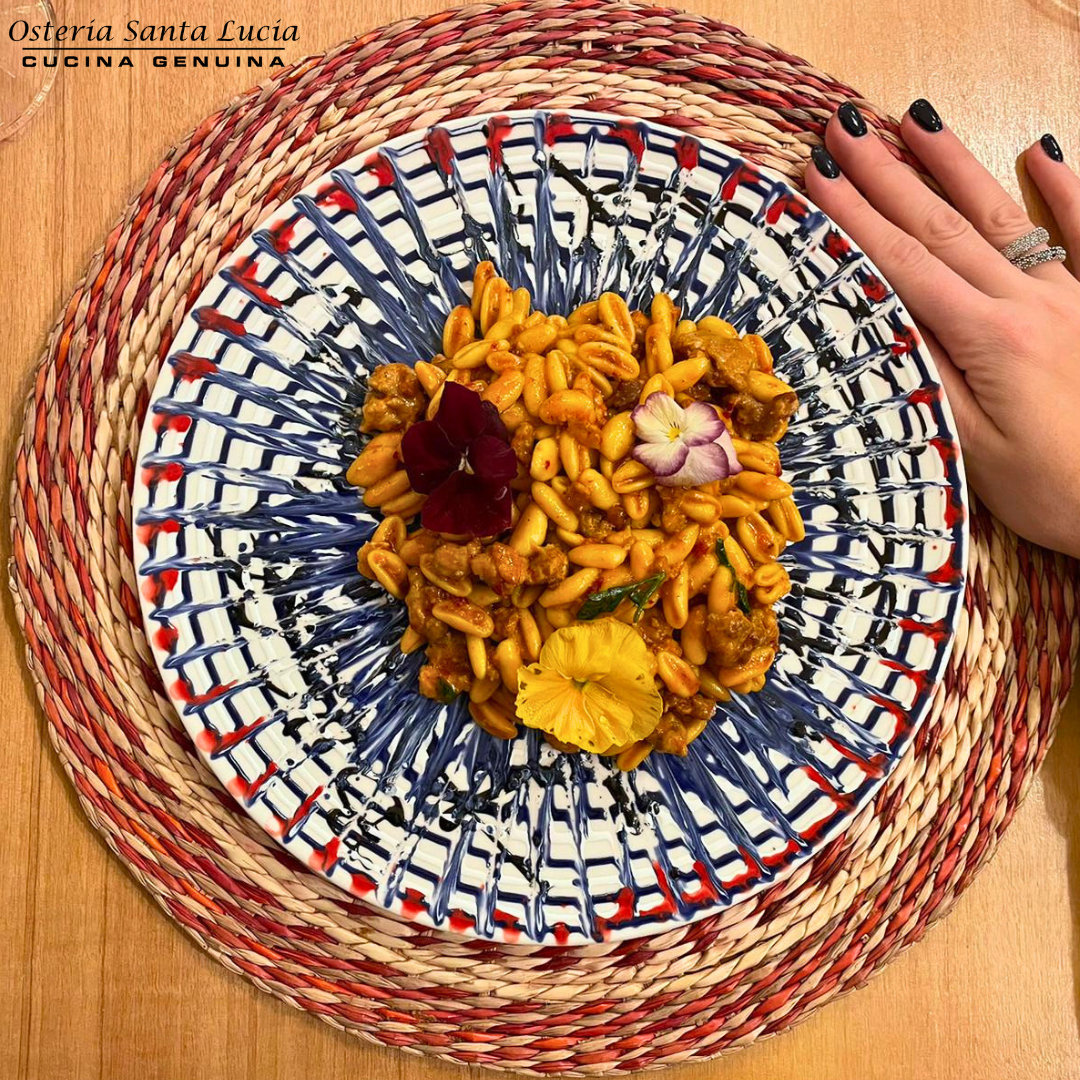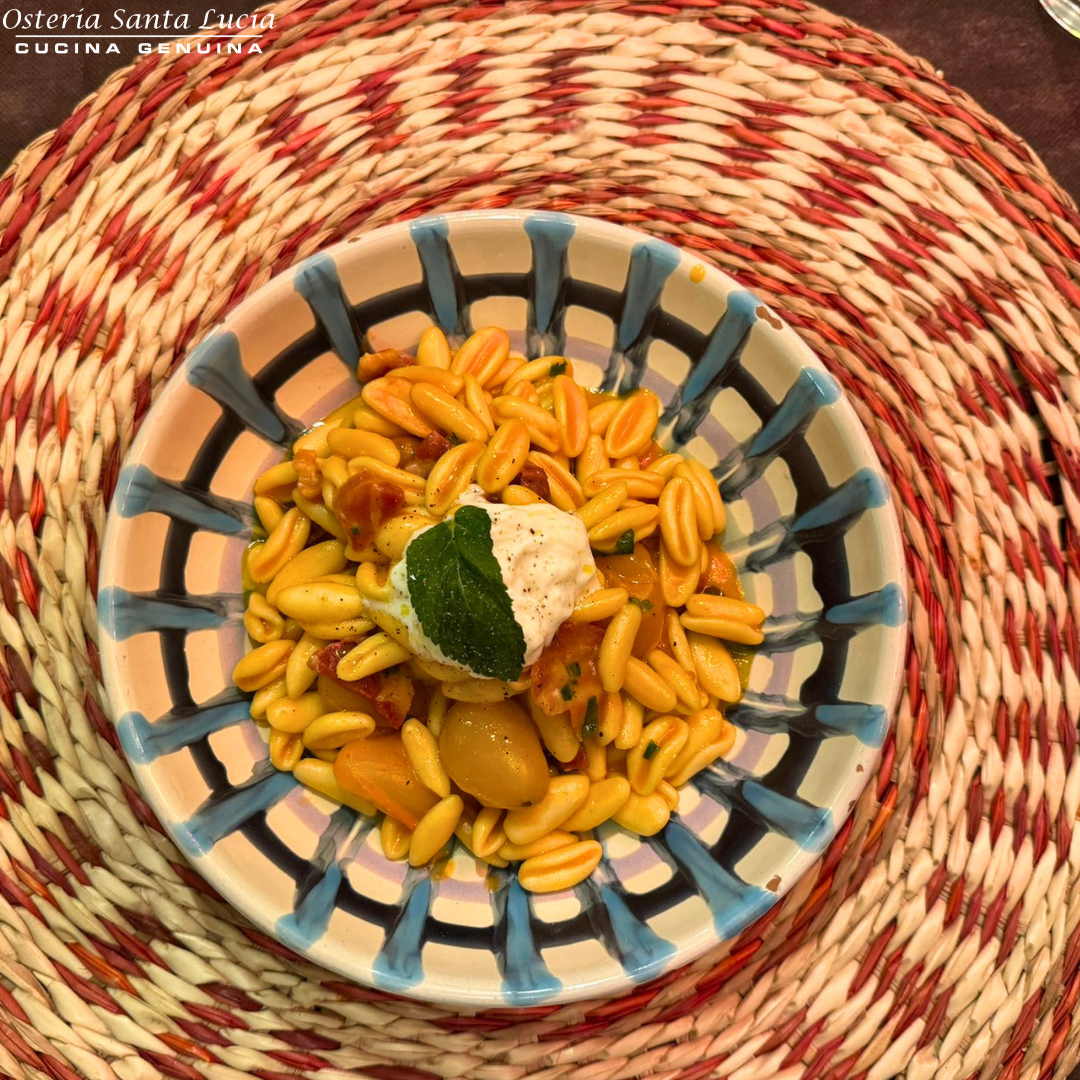 scoprite la vasta gamma di primi piatti squisiti che Osteria Santa Lucia ha da offrire. Dai nostri Scialatielli con Chips di Pecorino, Funghi Porcini e Tartufo, un piatto ricco di sapori e texture, alle nostre Trofie al Pesto di Zucchine e Stracciatella, una rivisitazione moderna di un classico della cucina italiana. Non perdete l’occasione di assaggiare le nostre Tagliatelle Fatte in Casa con Ragù Classico, un vero comfort food che riscalda il cuore.